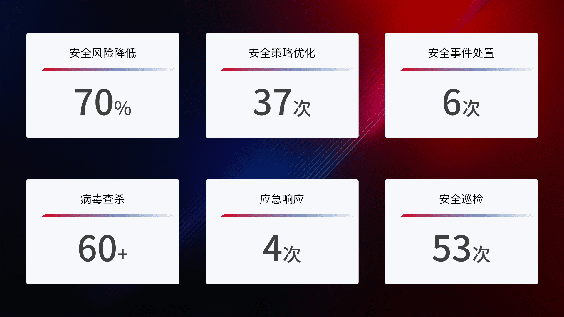 提供全面的安全事件报告体系,,,,包括处置报告、、、、周报、、、、季度和年度总结,,,结合持续监控,,帮助客户深入了解网络安全状况。。。。