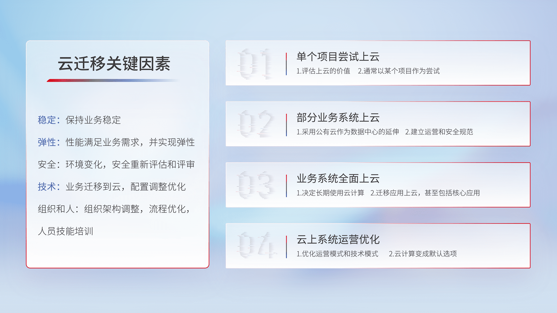 结合实际业务,,,从规划设计、、、、云平台选型、、、云原生改造、、、数据迁移、、集成交付,,,,迁移全过程为客户识别最佳上云路径,,,做好风险识别管理,,,设计网络架构、、身份权限、、、、安全审计合规、、、、操作审计、、、、日志审计、、、、监控告警策略、、、、多站点容灾设计等,,,对云上基础设施进行整体规划,,提升IT治理水平,,以满足弹性、、、高可用、、、、高性能的需求。。。。
