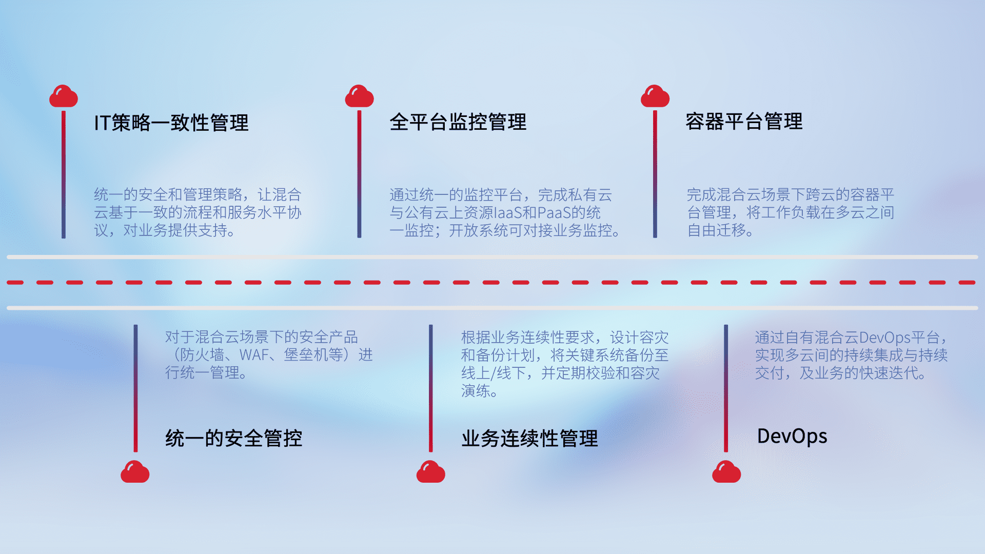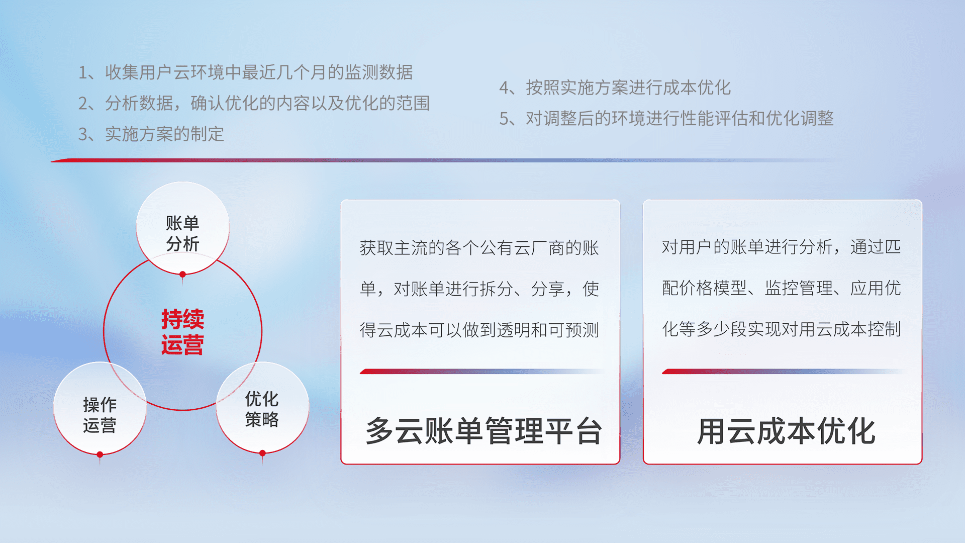 通过多云纳管,,以统一的资源数据模型把客户的云资源进行抽象和封装,,进而实现对多云资源的统一操作,,,,保障云资源管理的可靠性、、、稳定性与可用性。。。量身定制化运维内容,,,,配置、、、开发运维、、、补丁管理、、、、备份、、、监控、、、、认证和访问管理、、审计和日常巡检等,,保障在用云过程中的可靠度,,稳定度以及高可用率。。。。