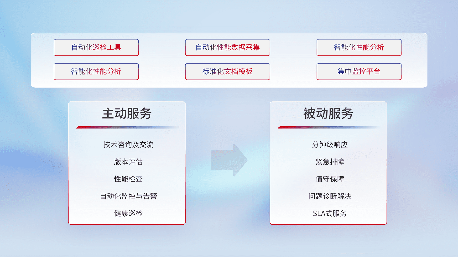 智能化工具和标准化文档,,,,保障服务质量,,,提供主动服务(包含技术咨询、、版本评估、、性能检查、、、自动化监控与告警、、、健康巡检)和被动服务包含(分钟级响应、、紧急排障、、、、值守保障、、问题诊断解决、、、、SLA服务)。。。
