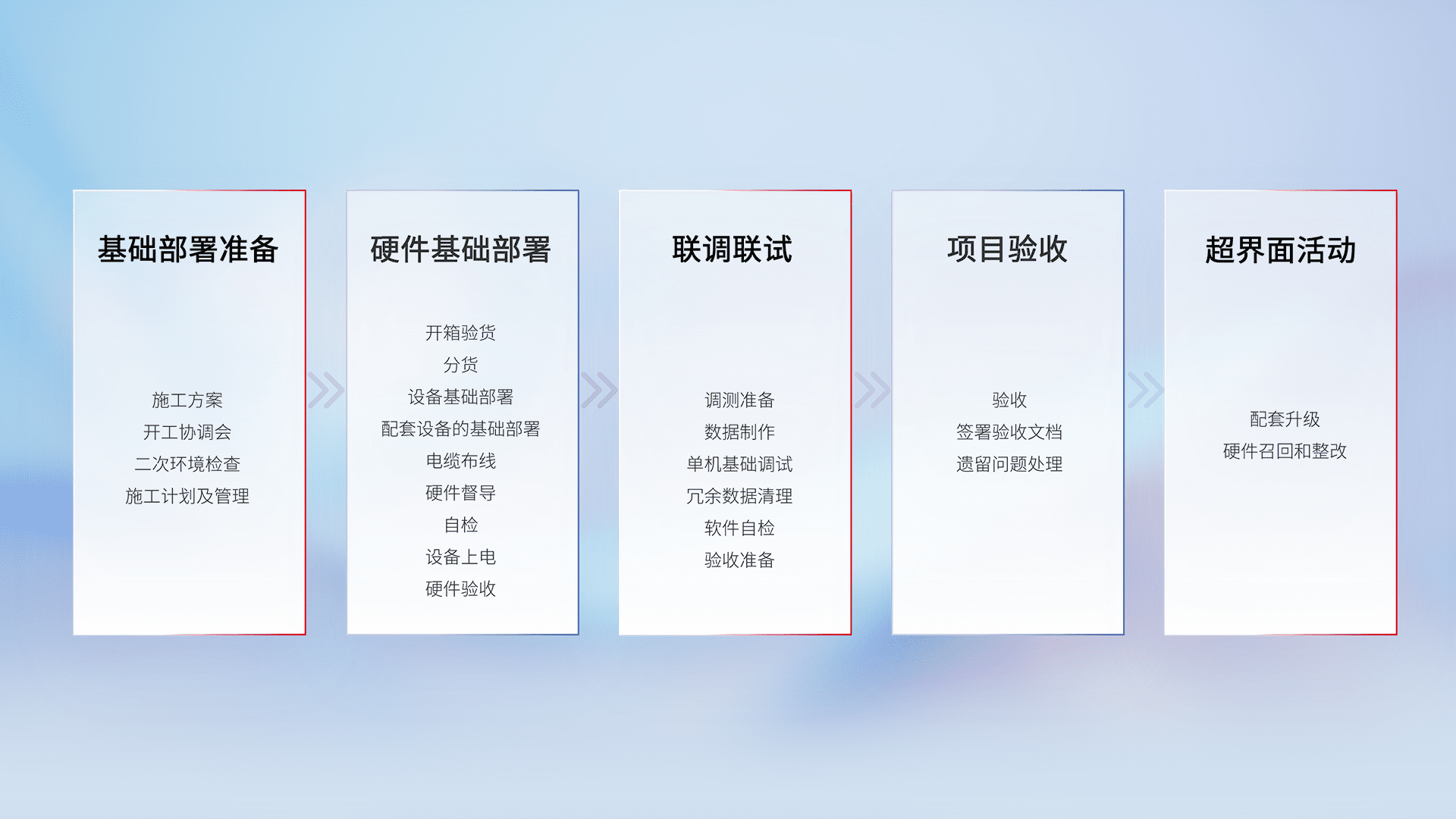 从基础部署准备、、、、硬件基础部署、、、联调联试、、、、项目验收、、、、越界面活动的全过程可追溯,,,,保证施工质量和进度。。。